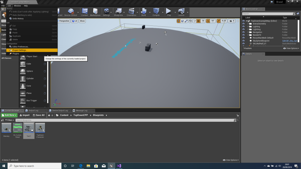 For this brawl game I started with the Top down project template. This sets up a top down character and small test area. When the project is run you can move the player character by clicking in the environment where you want the player actor to move to. I am also using Paragon SunWukong character which is free on the Unreal asset store.