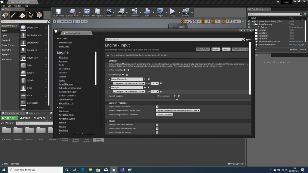 Find engine input, and clear out any current mappings. Add two new mappings, call the first one “ForwardsBackwards” and the second “LeftRight”. Under ForwadsBackwards bind that to “Gamepad Left Thumbstick Y-axis”. Under “LeftRight” bind “Gamepad Left ThumbStick X-Axis” both scale values should be 1.0. This is important because moving the thumb stick all the way forward will give up a value of 1.0, and all the way back –1.0. The same for left and right.